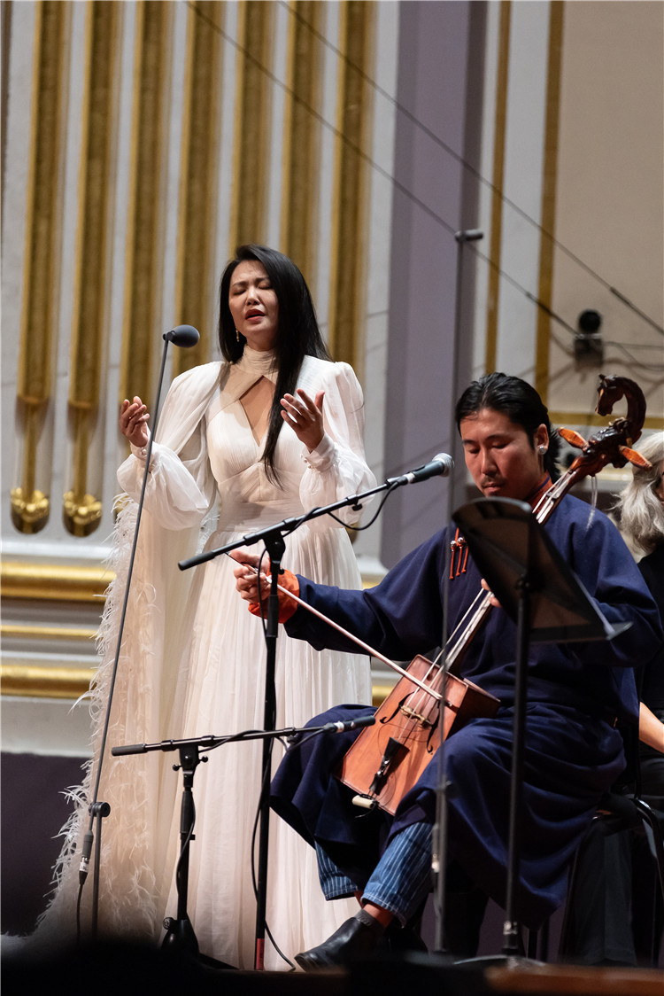 這場(chǎng)精彩的演出由多國(guó)藝術(shù)家和演員聯(lián)袂奉獻(xiàn),堪稱國(guó)際文化交流的一次成功實(shí)踐。與譚盾合作的有蘇格蘭皇家交響樂團(tuán)、愛丁堡藝術(shù)節(jié)合唱團(tuán)、蘇格蘭皇家交響樂團(tuán)青少年合唱團(tuán);獨(dú)唱的演員有六位,來自加拿大的男中音艾略特·馬多爾一人飾演多個(gè)角色、細(xì)膩把握了不同人物的復(fù)雜情緒;中國(guó)著名歌手譚維維與蒙古族馬頭琴手巴圖巴根共同演繹的凄美愛情故事增強(qiáng)了音樂的戲劇性;陳晨、鄺曼玉和鐘曼珊三位歌唱家的高水平演唱也給觀眾留下深刻印象。此外,陳奕寧反彈琵琶的樂舞表演,也為音樂會(huì)增添了視覺詩(shī)意。