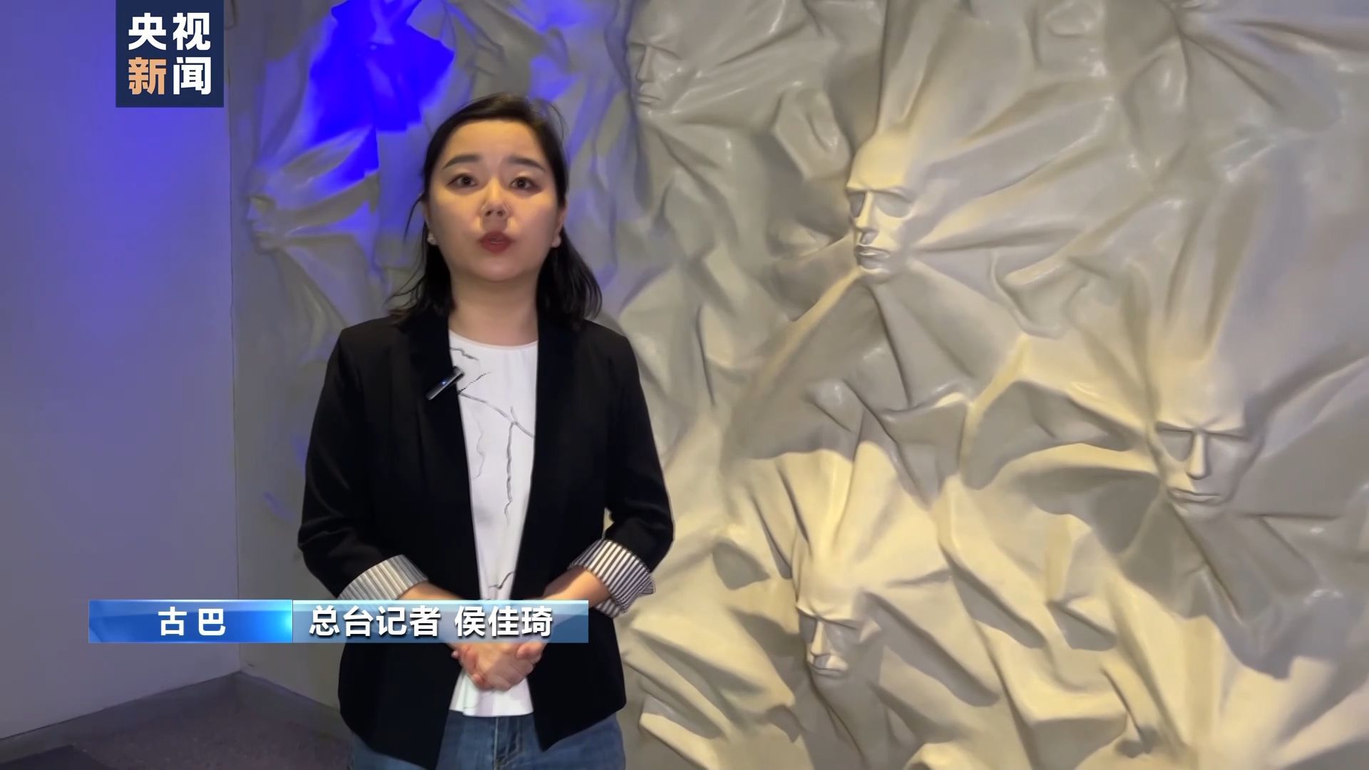 總臺(tái)記者 侯佳琦:這里是古巴首都哈瓦那米拉瑪爾區(qū)5街和14街的街角,我身后的這個(gè)白色建筑在1959年到1962年曾經(jīng)是古巴國(guó)家安全機(jī)關(guān)行動(dòng)科的本部。在象征著古巴國(guó)旗顏色的紅、白、藍(lán)燈光的照射下,我們最先映入眼簾的就是布滿白色墻壁的這些黑色小型十字架。這里一共有3478個(gè)十字架,代表著古巴自革命勝利以來(lái)至今古巴統(tǒng)計(jì)的在美國(guó)反古行動(dòng)中遇害的人數(shù)。地面上我們可以看到一個(gè)個(gè)由混凝土制成的小方塊緊緊擁簇,它們象征著古巴人民團(tuán)結(jié)一致,古巴革命堅(jiān)不可摧。