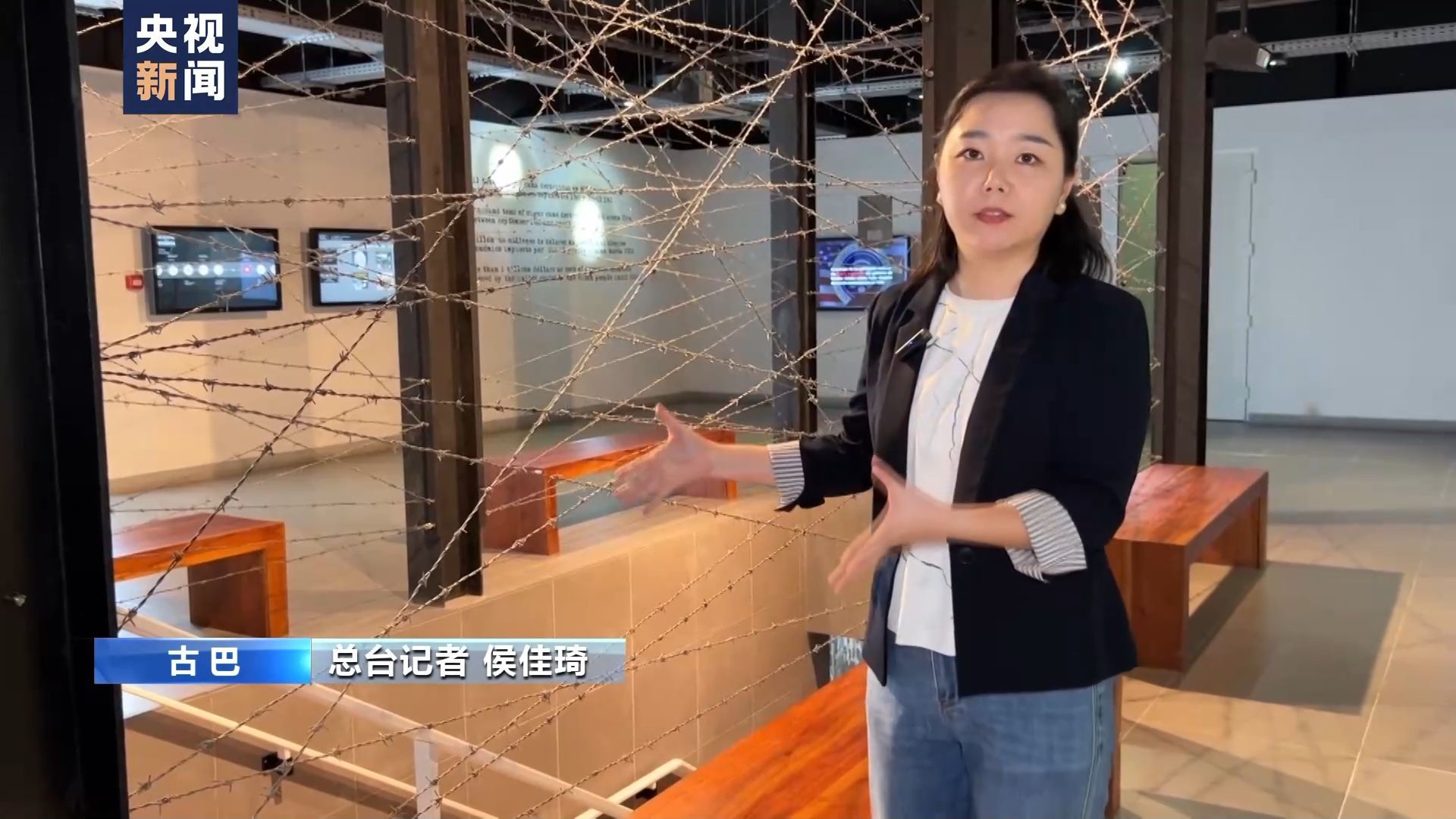 總臺(tái)記者 侯佳琦:館內(nèi)的每一處精心設(shè)計(jì)都具有其特殊的歷史含義,在這個(gè)樓梯兩側(cè)我們可以看到,鐵絲網(wǎng)和光纜射線縱橫交織,形成錯(cuò)綜復(fù)雜的網(wǎng)絡(luò),給人一種壓迫感,這代表著美國(guó)政府通過(guò)制裁措施和媒體網(wǎng)絡(luò)對(duì)古巴實(shí)施經(jīng)濟(jì)和信息封鎖。