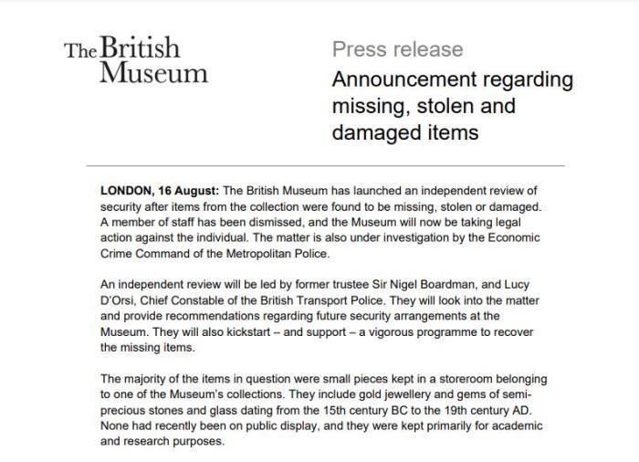 藏品丟失的具體時(shí)間沒(méi)有說(shuō)明,但據(jù)大英博物館董事會(huì)董事長(zhǎng)喬治·奧斯本表示,董事會(huì)成員在“今年早些時(shí)候”得知此事,非常擔(dān)憂。