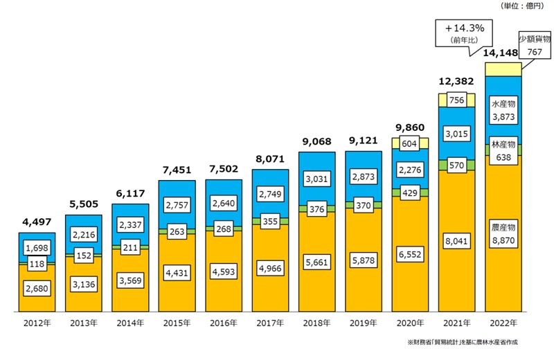日本農(nóng)林水產(chǎn)品和食品出口金額示意圖。圖片來源:日本農(nóng)林水產(chǎn)省網(wǎng)站
