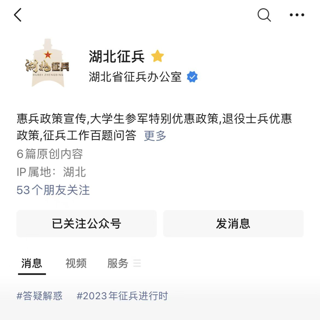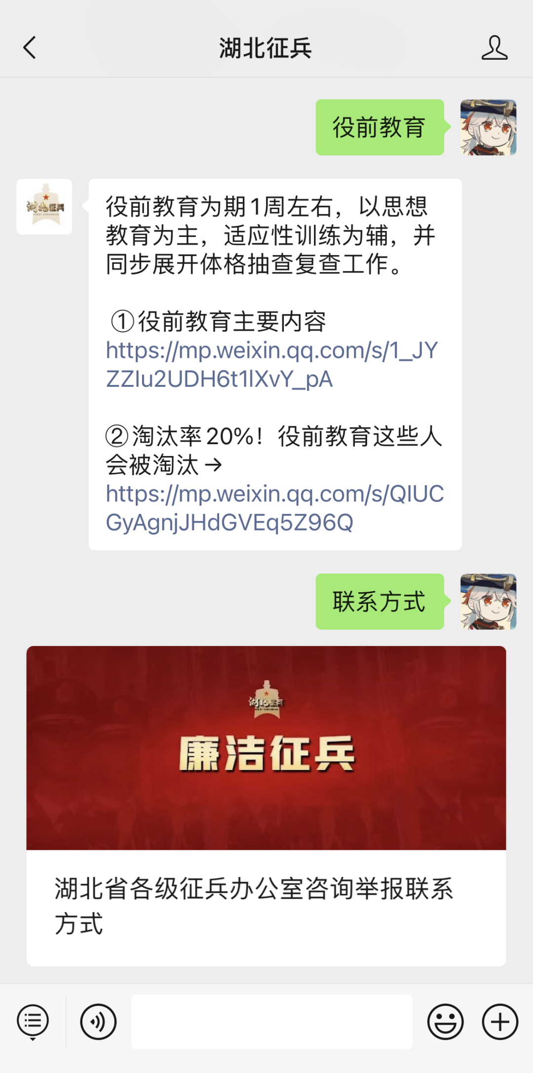 “湖北征兵”微信公眾號,是湖北省人民政府征兵辦公室唯一官方認(rèn)證賬號。后臺設(shè)置“自動回復(fù)”功能,大家可以在后臺輸入“聯(lián)系方式”“役前教育”等關(guān)鍵詞匯,獲取相關(guān)信息: