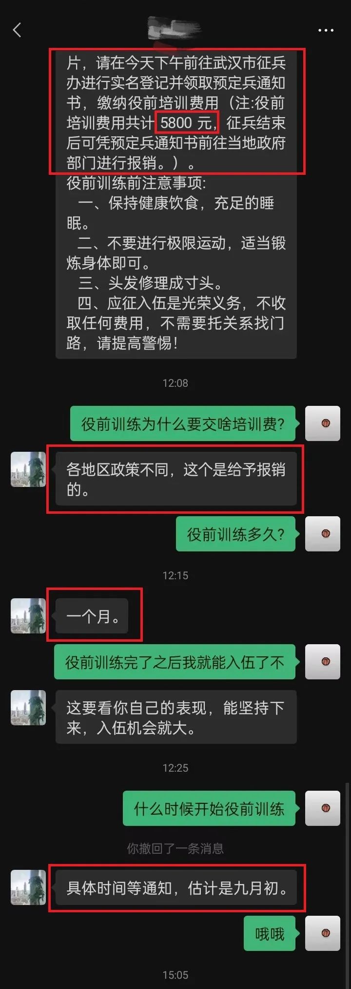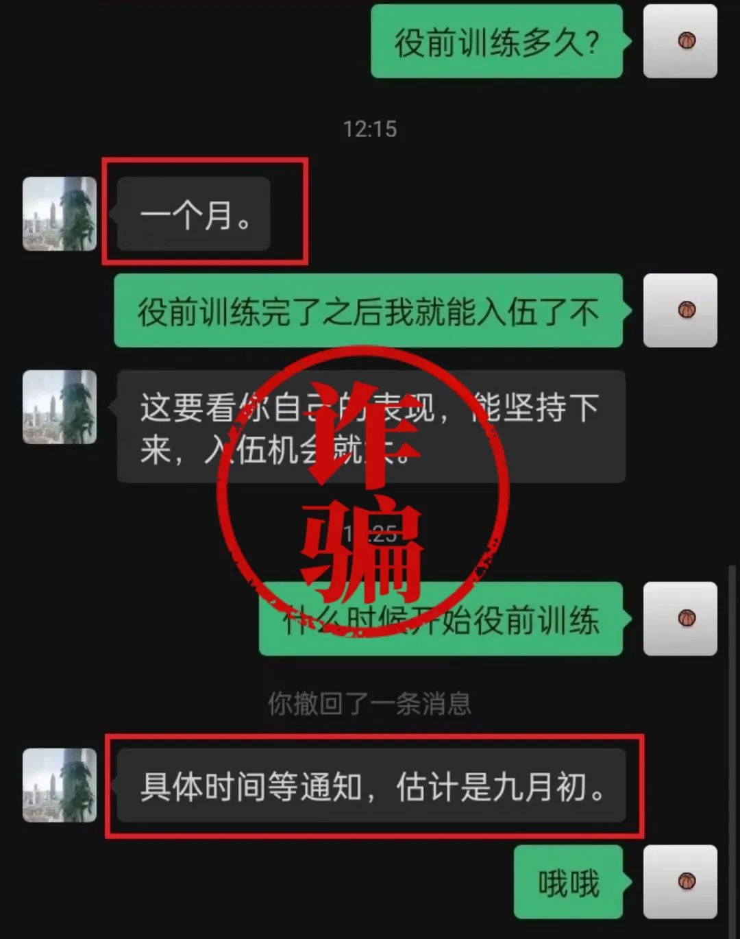騙子聲稱“繳納役前培訓(xùn)費(fèi)用”,還說可憑預(yù)定兵通知書進(jìn)行報銷,甚至提醒應(yīng)征青年役前教育的相關(guān)注意事項。話術(shù)編造得看似完整,但是再三強(qiáng)調(diào)“參軍不花一分錢”,役前教育怎么可能需要繳費(fèi)呢?