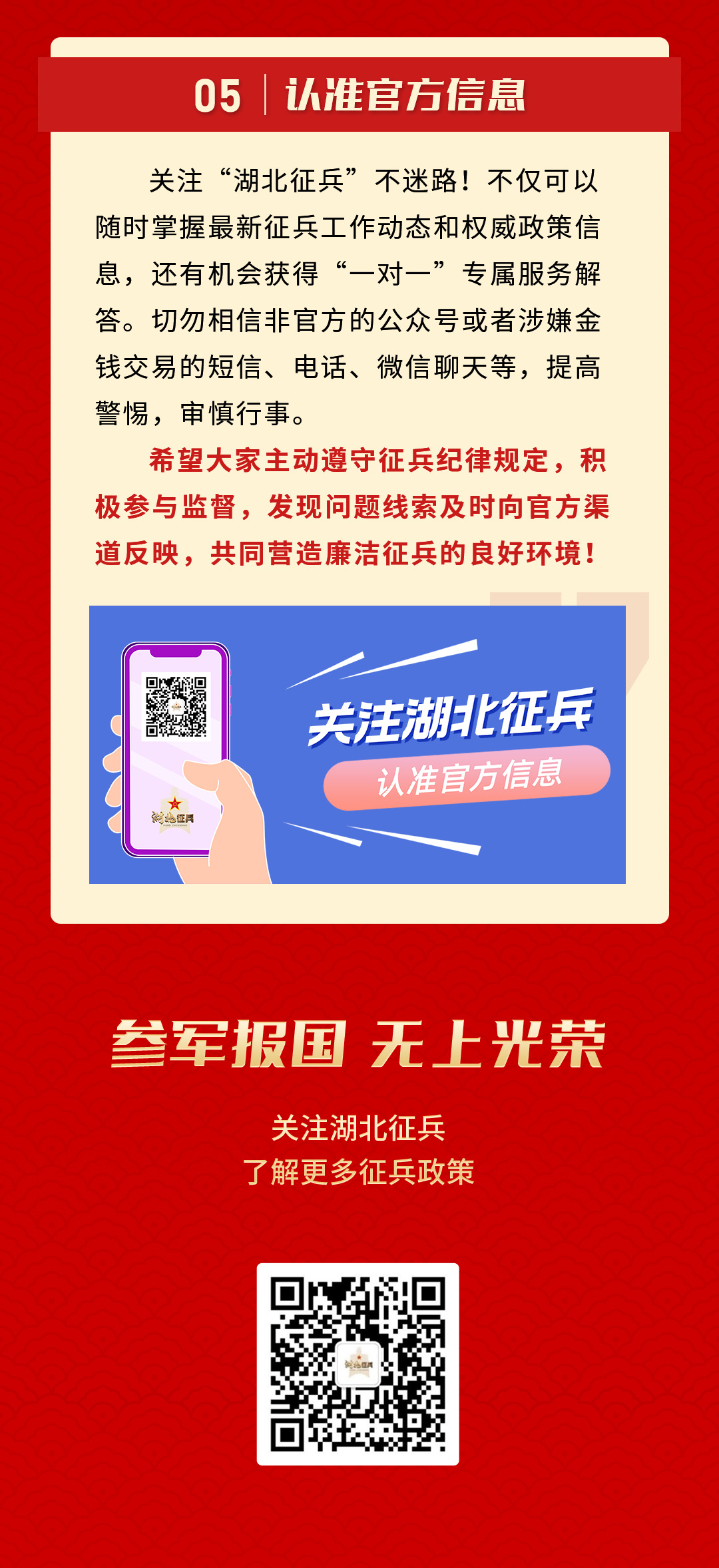 參軍入伍相關(guān)信息,以各級兵役機(jī)關(guān)發(fā)布為準(zhǔn),入伍青年手續(xù)通過兵役機(jī)關(guān)正規(guī)渠道辦理,如果遇到“征兵詐騙”,可以向各級兵役機(jī)關(guān)舉報,不法分子必將受到法律嚴(yán)懲。