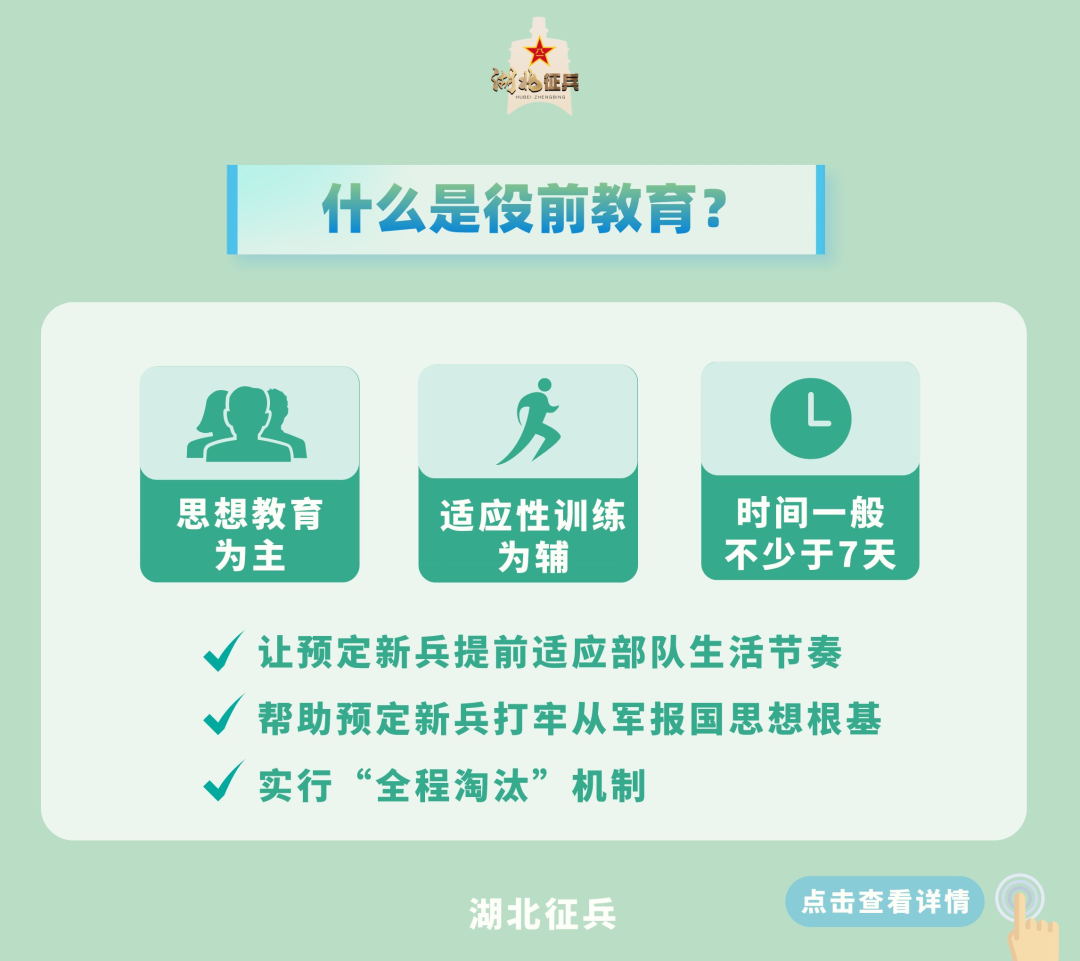 荊楚網(wǎng)(湖北日報網(wǎng))訊(記者 黃騰)征兵體檢政考“雙合格”之后,下一步就要參加“役前教育”。