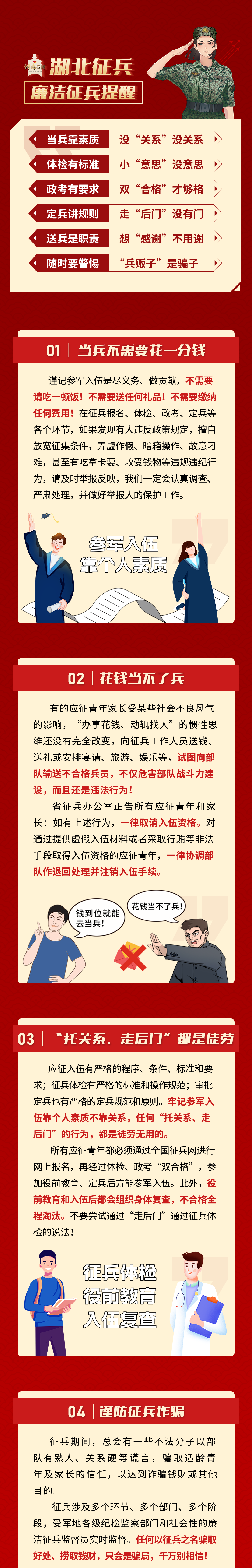 所有應(yīng)征青年和家長都要記住,參軍入伍不需要花一分錢,應(yīng)征報名、征兵體檢、政治考核、役前教育等每一個參軍入伍的流程都不需要繳納任何費(fèi)用。兵役機(jī)關(guān)工作人員不會以任何名義向應(yīng)征青年或家長收取任何費(fèi)用!任何以征兵之名騙取好處或者撈取錢財?shù)亩际球_局,不要相信!如果在應(yīng)征入伍的過程中,遇到有人以征兵之名索要錢財,可以撥打各地征兵辦咨詢舉報電話進(jìn)行反映,并提供相關(guān)線索,我們一定會認(rèn)真調(diào)查、嚴(yán)肅處理,并做好舉報人的保護(hù)工作。