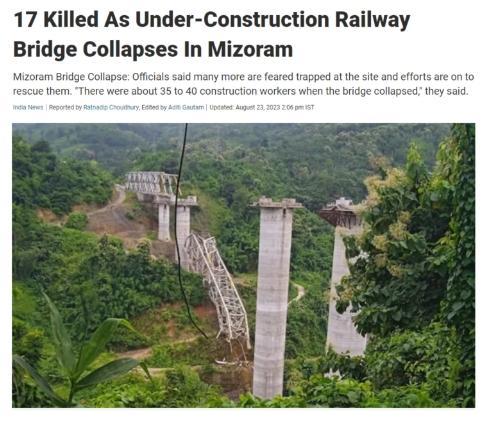 中新網(wǎng)8月23日電 據(jù)印度電視臺報道,當?shù)貢r間23日,印度警方稱,米佐拉姆邦塞朗地區(qū)附近一座正在施工的鐵路橋倒塌,造成至少17名工人遇難。