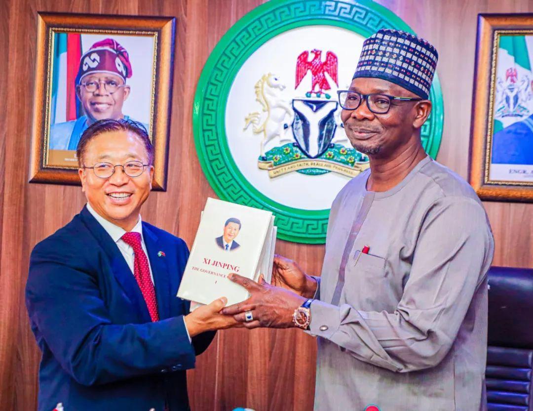 駐尼日利亞大使崔建春(左)向納薩拉瓦州州長蘇勒贈送《習(xí)近平談治國理政》系列書籍。駐尼日利亞使館供圖