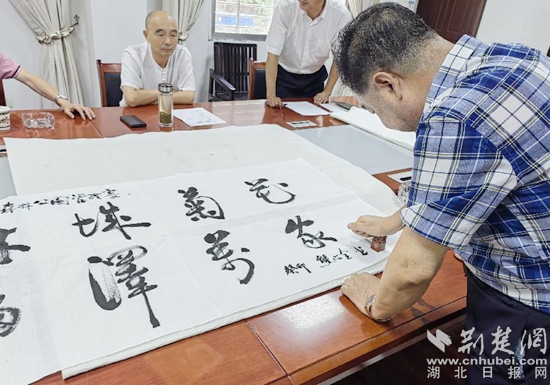 最后,由麻城市楹聯(lián)協(xié)會副會長、書法協(xié)會理事熊心全現(xiàn)場揮毫題字。
