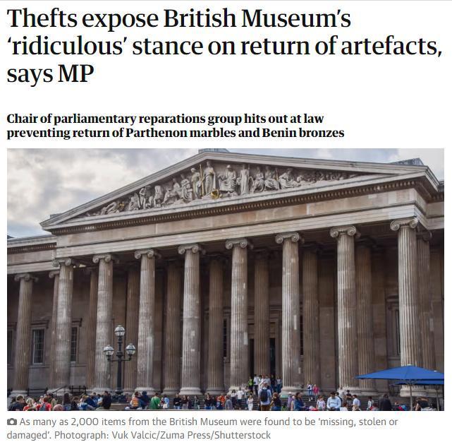 中新網(wǎng)8月28日電 據(jù)英國《衛(wèi)報(bào)》當(dāng)?shù)貢r(shí)間27日?qǐng)?bào)道,對(duì)于近期大英博物館館藏被盜事件,一名英國議員表示,該事件暴露了大英博物館以安全為由,拒絕將有爭議文物歸還原籍國的借口“荒謬”且“具有侮辱性”。
