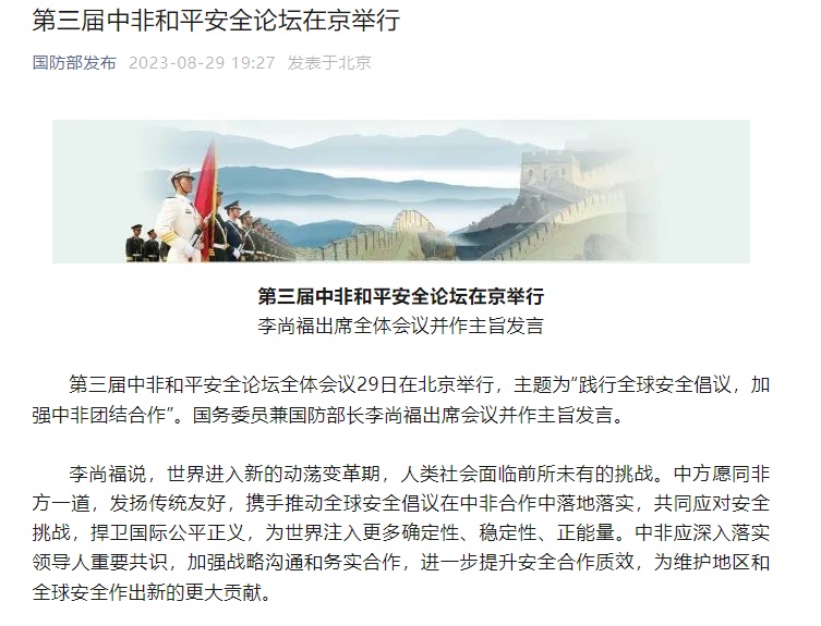 第三屆中非和平安全論壇于8月28日至9月2日舉行,是新冠疫情之后首次在線下舉行,來自非盟和近50個非洲國家的百余位高級代表出席本屆論壇。此次論壇主題為“踐行全球安全倡議,加強中非團結(jié)合作”,旨在進一步加強中非防務(wù)部門戰(zhàn)略溝通,為構(gòu)建新時代中非命運共同體發(fā)揮積極作用。