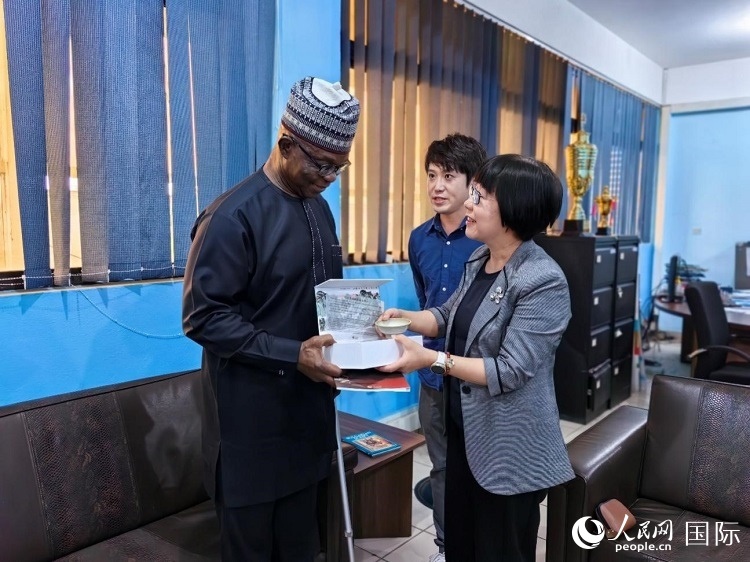 人民網(wǎng)監(jiān)事會(huì)主席唐維紅(右一)帶隊(duì)訪問尼日利亞通訊社,與該社總裁布克·龐勒(左一)交流。人民網(wǎng)記者 陳星星攝