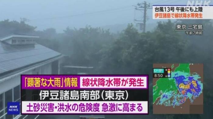 當(dāng)?shù)貢r(shí)間8日早上,受臺風(fēng)“鴛鴦”影響,日本東京三宅島出現(xiàn)暴雨天氣。圖片來源:日本放送協(xié)會(NHK)報(bào)道截圖