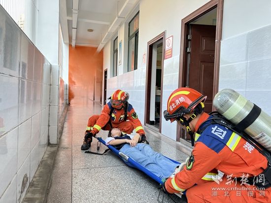 伴隨著陣陣緊促的警笛聲在校園響起,一教室內(nèi)“電線短路”,引燃桌面書籍,頓時(shí)濃煙滾滾?!罢?qǐng)各位同學(xué)不要驚慌,捂住口鼻、低頭彎腰、貼墻往樓下有效進(jìn)行疏散......”廣播中傳來疏散指令,消防員指導(dǎo)全體師生從“安全出口”有序迅速撤離,通過體驗(yàn)“生命通道”,使師生掌握火場(chǎng)疏散逃生技能。