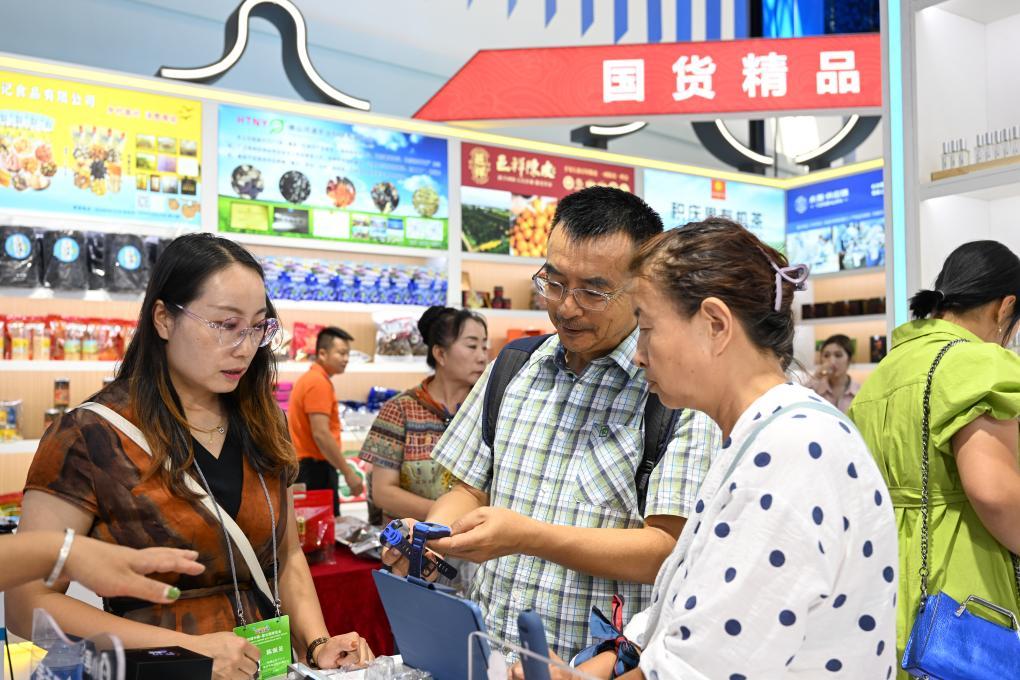 9月6日,游客(中)在第四屆中國(guó)—蒙古國(guó)博覽會(huì)上選購(gòu)商品。新華社記者 貝赫 攝