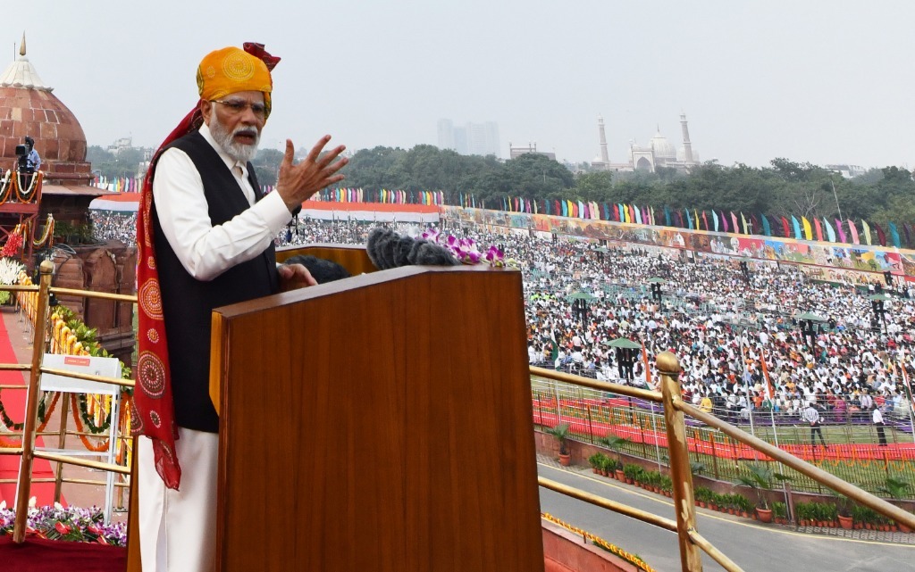 8月15日,印度總理莫迪在德里出席獨(dú)立日慶?;顒?dòng)時(shí)發(fā)表講話。新華社發(fā)