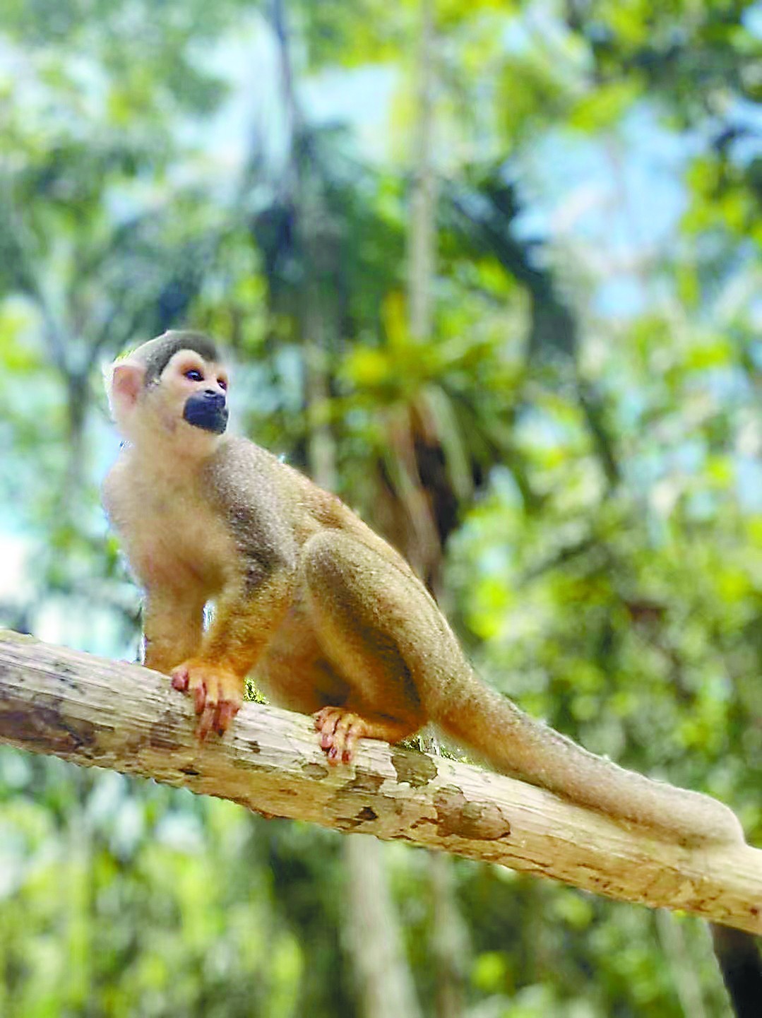 穿過村子進入雨林,步行20分鐘到達保護區(qū)。這是一個與雨林融為一體、開放式的保護中心,空地上已然成為猴子們的樂園。首先迎接我們的是絨毛猴,這種猴子屬于亞馬孫體型較大的猴類,滿身灰灰的茸毛讓人有撫摸的沖動。它的額頭扁平像是戴著一頂平角帽,一幅老實憨厚的樣子。相比較之下,蜘蛛猴就活躍多了,記者正拿著自拍桿拍攝,突然一只蜘蛛猴順著記者的肩膀爬了過來,一把抓向相機,制造了“車禍”現(xiàn)場。蜘蛛猴身體小巧,四肢非常靈活,尾巴又長又有力,經(jīng)??吹剿鼈冇梦舶驮跇渲χg吊來吊去,像蜘蛛一樣有黏性,所以得名蜘蛛猴。