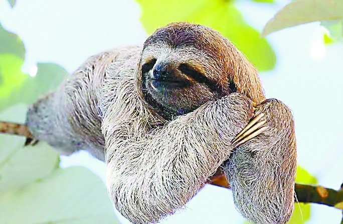 在亞馬孫雨林的第四天,記者坐船橫跨亞馬孫河,來到秘魯一側的卡考區(qū)域。在樹懶保護區(qū)工作人員蒂亞戈的帶領下,記者鉆入熱帶雨林尋覓樹懶蹤影。在潮濕悶熱的雨林里穿行需要幾分耐力,同時必須穿上雨靴才能在泥濘的地面上前行。蒂亞戈走在前邊開路,記者跟在后邊有點自顧不暇,雙手不停剝開擋在眼前的茂密植被。大概穿行了20分鐘,蒂亞戈停下腳步,悄悄剝開面前的一團樹葉,只見一團灰色的小肉球紋絲不動地倒掛在樹杈上,黑色的爪子像彎鉤一般緊緊勾住樹枝。蒂亞戈告訴記者,這是一只未成年的小樹懶,它可以保持同樣的姿勢一整天紋絲不動。由于小樹懶始終縮成一團,頭深深埋在樹葉里呼呼大睡,雖然記者距離它只有一兩米遠,但始終無法一睹真容。樹懶“睡覺大王”的稱號可不是浪得虛名,蒂亞戈說這些家伙每天要睡15至18個小時。它們的睡法類似冬眠,入眠后體溫會降低,醒來后又恢復正常水平。因此,樹懶較慢的新陳代謝可以讓食物在體內(nèi)存儲較長時間。蒂亞戈笑呵呵地告訴記者,樹懶一個星期才上一次廁所。