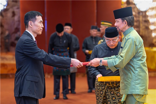 肖建國大使在努洛伊曼王宮向文萊蘇丹哈桑納爾遞交國書。中國駐文萊大使館供圖