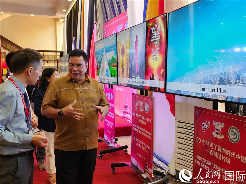 圖為菲律賓國(guó)家圖書(shū)館館長(zhǎng)阿德里亞諾參觀新時(shí)代中國(guó)圖片展。人民網(wǎng)記者樊帆攝