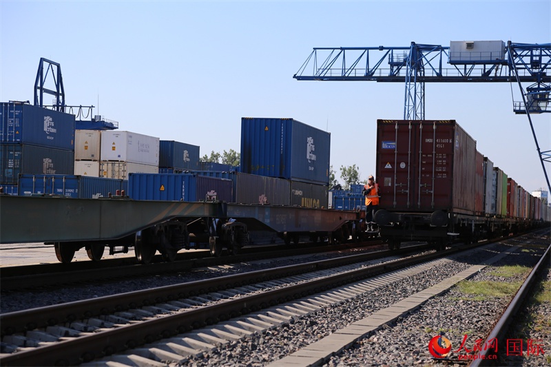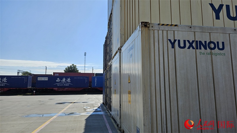 | 來自中國重慶的集裝箱貨物等待換裝。人民網(wǎng)記者 王震攝 |