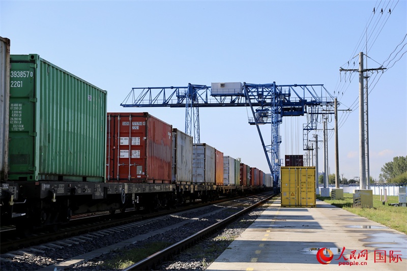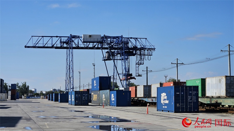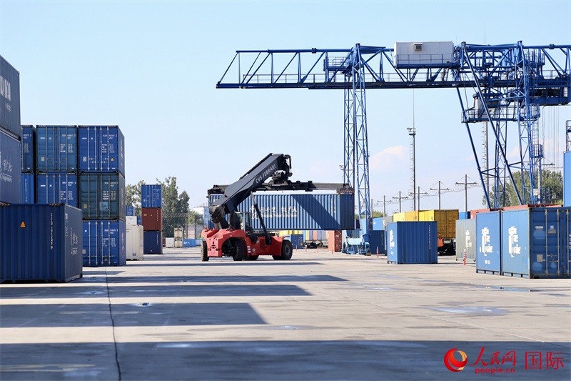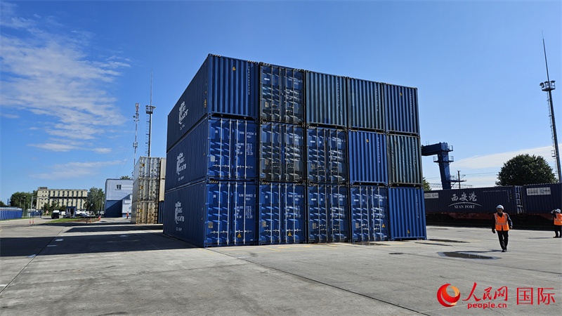 | 來自中國的集裝箱貨物等待換裝。人民網(wǎng)記者 王震攝 |