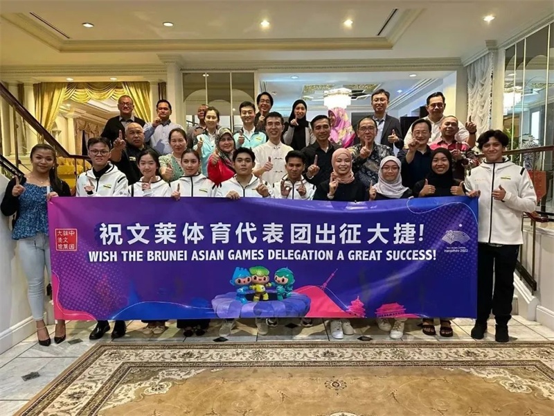 肖建國歡迎阿米瑞茲及參賽運動員做客使館,高度評價兩國體育領(lǐng)域友好交流與合作,預(yù)祝代表團在杭州亞運會上取得優(yōu)異成績,為文萊和中文友好做出貢獻。