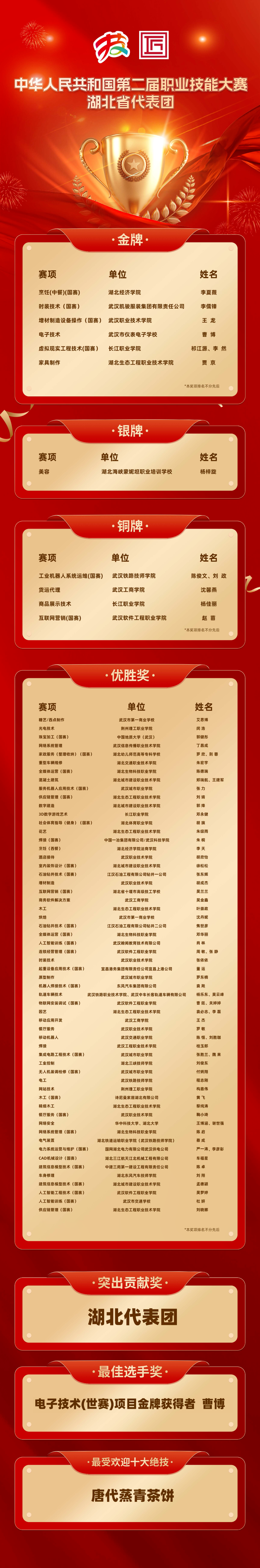 9月19日,中華人民共和國(guó)第二屆職業(yè)技能大賽在天津閉幕,在109個(gè)賽項(xiàng)中,湖北代表團(tuán)勇奪6個(gè)項(xiàng)目金牌(7人)、1個(gè)項(xiàng)目銀牌(1人)、4個(gè)項(xiàng)目銅牌(5人),實(shí)現(xiàn)歷史性突破。