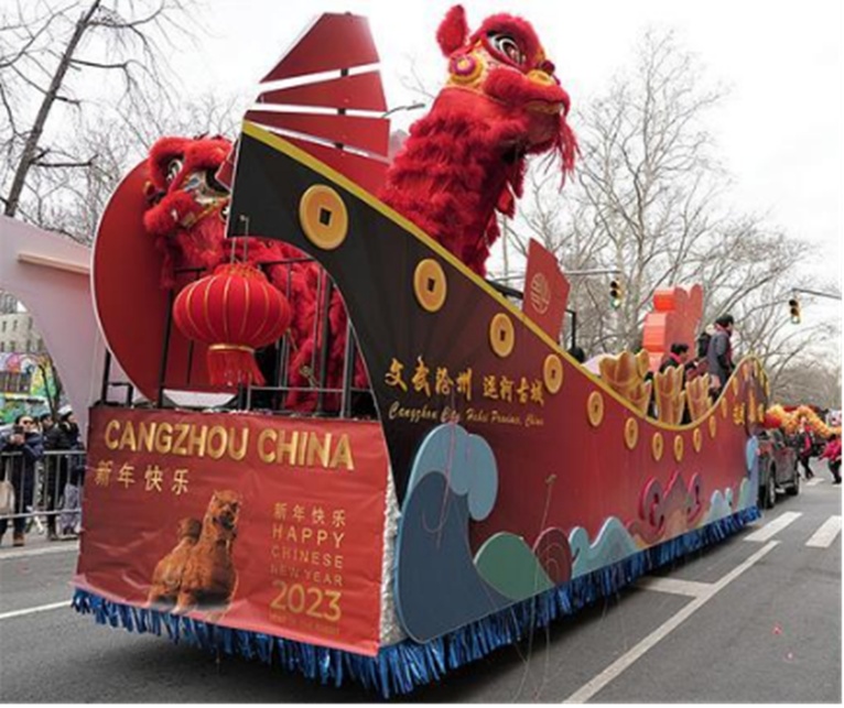 在紐約新春愛心花車大游行文化節(jié)上,“文武滄州,運(yùn)河古城”主題花車上演了一出“文化出?!钡暮脩颉嬷莼ㄜ囌w呈古船造型,船上還有舞獅表演。滄州立體造型花車被主辦方專門安排為頭車引領(lǐng)整個(gè)花車游行隊(duì)伍,在梅花、燈籠等傳統(tǒng)元素的加持下,呈現(xiàn)出一場動(dòng)人心弦的東方文化視覺盛宴,引得海外觀眾頻頻喝彩并按下快門,最終奪得本屆文化節(jié)“最美花車”稱號(hào)。