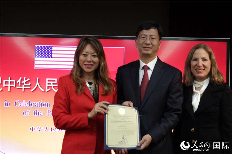 | 駐舊金山總領(lǐng)事張建敏(中)和加州副州長(zhǎng)康依蓮(右)、財(cái)務(wù)長(zhǎng)馬世云(左)在國(guó)慶招待會(huì)上。人民網(wǎng)記者 鄧圩攝 |