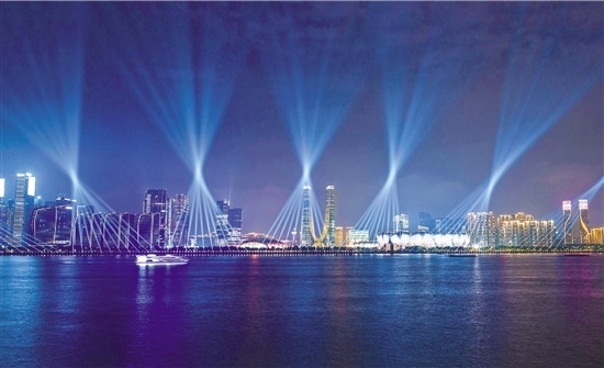 連日來,杭州奧體中心場館群璀璨奪目的燈光秀,將迎接亞運的氛圍拉滿。記者 梁臻 姚穎康 拍友 余文華 攝