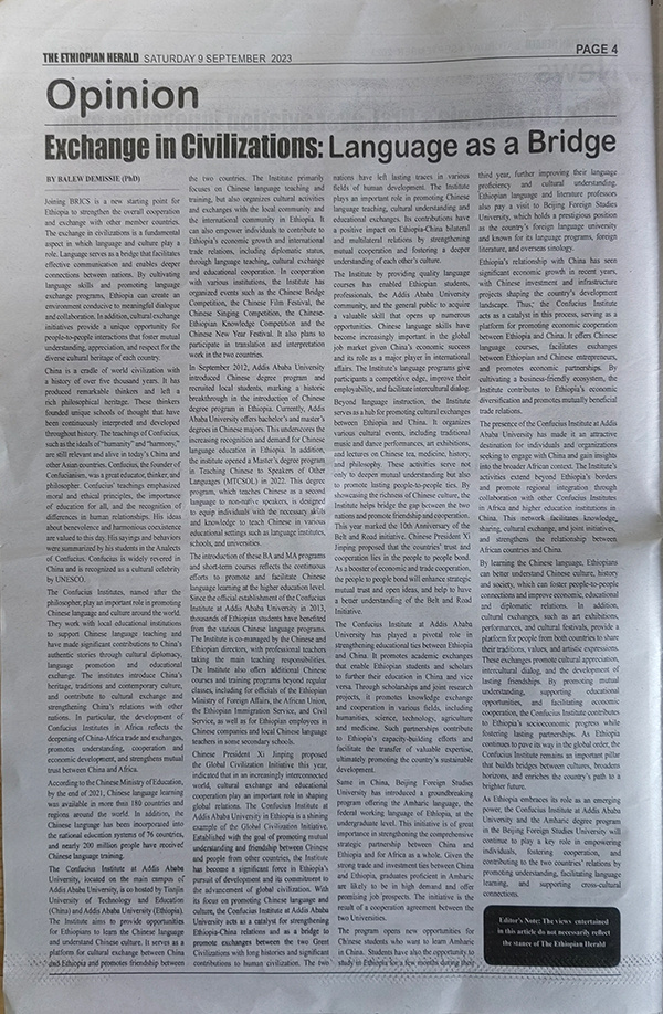人民網(wǎng)開羅9月25日電 (記者沈小曉)近日,埃塞俄比亞政策研究院研究員、亞的斯亞貝巴大學(xué)副教授巴盧·德米西在埃塞官方第一大報《埃塞先驅(qū)報》上撰文,以《文明交流:語言為橋》為題發(fā)表整版文章。文章提到,“加入金磚國家大家庭是埃塞俄比亞加強(qiáng)與其他成員國全面合作與交流的新起點。文明間的交流是基礎(chǔ),語言和文化在其中起著重要作用。語言是促進(jìn)國與國之間有效溝通、加強(qiáng)聯(lián)系的橋梁。”