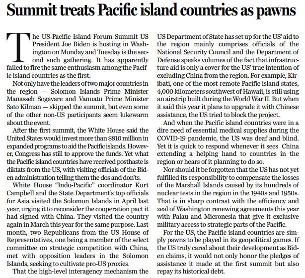 歸根結(jié)底,對(duì)美國(guó)而言,太平洋島國(guó)不過是其地緣政治博弈中的棋子。若美國(guó)真的想要促進(jìn)該地區(qū)的發(fā)展,那么它不僅會(huì)兌現(xiàn)首屆峰會(huì)上作出的援助承諾,也會(huì)償還歷史債務(wù)。