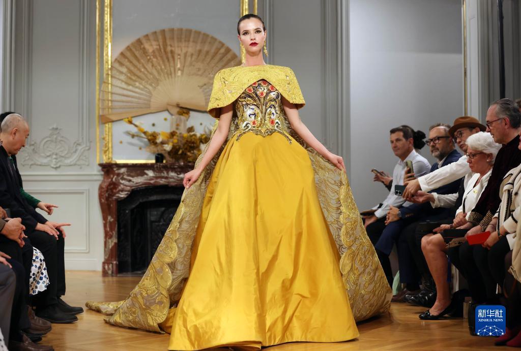 9月27日,模特在法國(guó)巴黎中國(guó)文化中心舉辦的“恭王府服飾秀”上展示設(shè)計(jì)師勞倫斯·許創(chuàng)作的恭王府系列高定服裝。新華社記者 高靜 攝