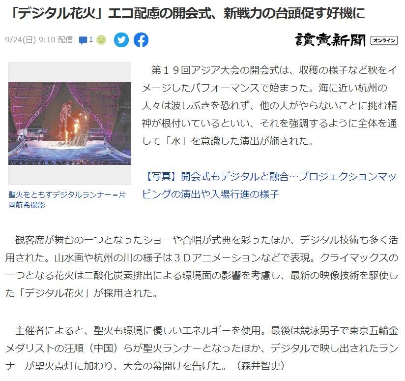 日本記者在對杭州亞運(yùn)會(huì)開幕式進(jìn)行報(bào)道時(shí)指出,演出以“水”為主題,展現(xiàn)出靠近大海的杭州人不懼海浪、敢為人先的精神,同時(shí)以3D動(dòng)畫形式展現(xiàn)杭州山水等的數(shù)字技術(shù)也令人印象深刻。此外,將觀眾席和舞臺(tái)連成一體的演出以及大合唱讓開幕式更為多彩。