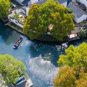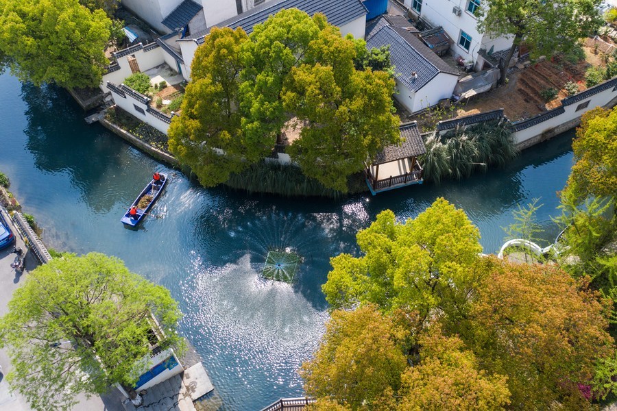 浙江省長(zhǎng)興縣龍山街道渚山村,保潔人員進(jìn)行日常河道護(hù)理巡查(2020年4月9日攝,無人機(jī)照片)。新華社記者徐昱攝