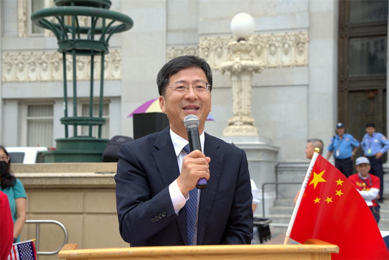 | 駐舊金山總領(lǐng)事張建敏出席東灣僑界慶祝中華人民共和國(guó)成立74周年升旗典禮。駐舊金山總領(lǐng)事館供圖 |