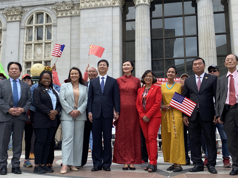 活動(dòng)現(xiàn)場(chǎng)醒獅歡舞、祥龍奔騰,引得中外嘉賓頻頻鼓掌,廣大僑胞們和各界友人揮舞中美國(guó)旗,盛贊新中國(guó)發(fā)展建設(shè)取得的輝煌成就及中華文化獨(dú)特魅力,祝愿中美兩國(guó)人民友誼長(zhǎng)存。