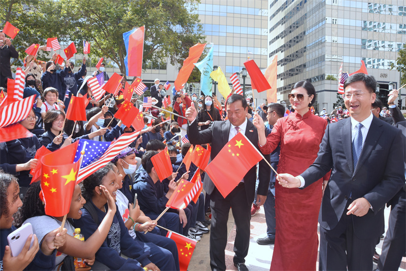 張建敏寄語(yǔ)現(xiàn)場(chǎng)觀(guān)禮的中小學(xué)生,中美關(guān)系的未來(lái)在青年,期待包括各位同學(xué)在內(nèi)的美國(guó)朋友到中國(guó)走一走、看一看,增進(jìn)對(duì)中國(guó)的了解,為中美關(guān)系改善發(fā)展貢獻(xiàn)力量。