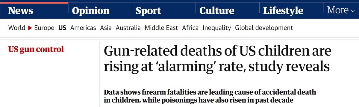 據(jù)英國《衛(wèi)報(bào)》網(wǎng)站5日?qǐng)?bào)道,美國波士頓兒童醫(yī)院(Boston Children's Hospital)研究人員進(jìn)行的一項(xiàng)新的研究發(fā)現(xiàn),在過去十年中,美國與槍支有關(guān)的兒童死亡人數(shù)激增,漲幅高達(dá)87%。