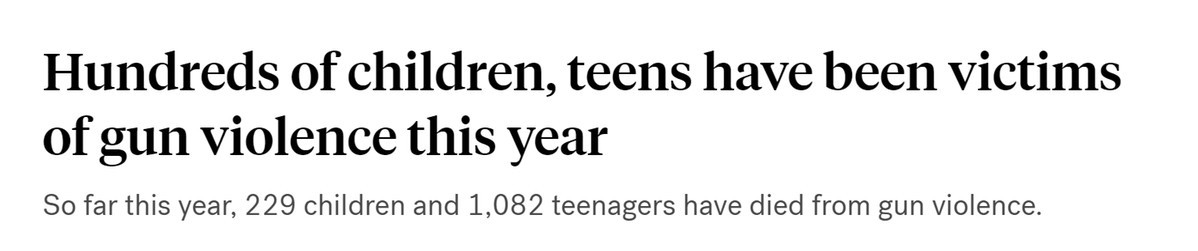 “槍支暴力檔案”的數(shù)據(jù)顯示,2023年到目前為止,美國已有229名年齡在11歲以下的兒童以及1082名青少年死于槍支暴力,受傷人數(shù)高達(dá)515名兒童和3025名青少年。