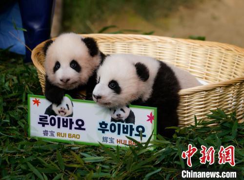 旅韓大熊貓“愛寶”“樂寶”的雙胞胎雌性幼崽即將出生滿百日。12日上午,位于韓國京畿道龍仁市的愛寶樂園熊貓館舉行雙胞胎幼崽首次公眾見面會(huì),并公布了它們的名字為“睿寶”和“輝寶”。