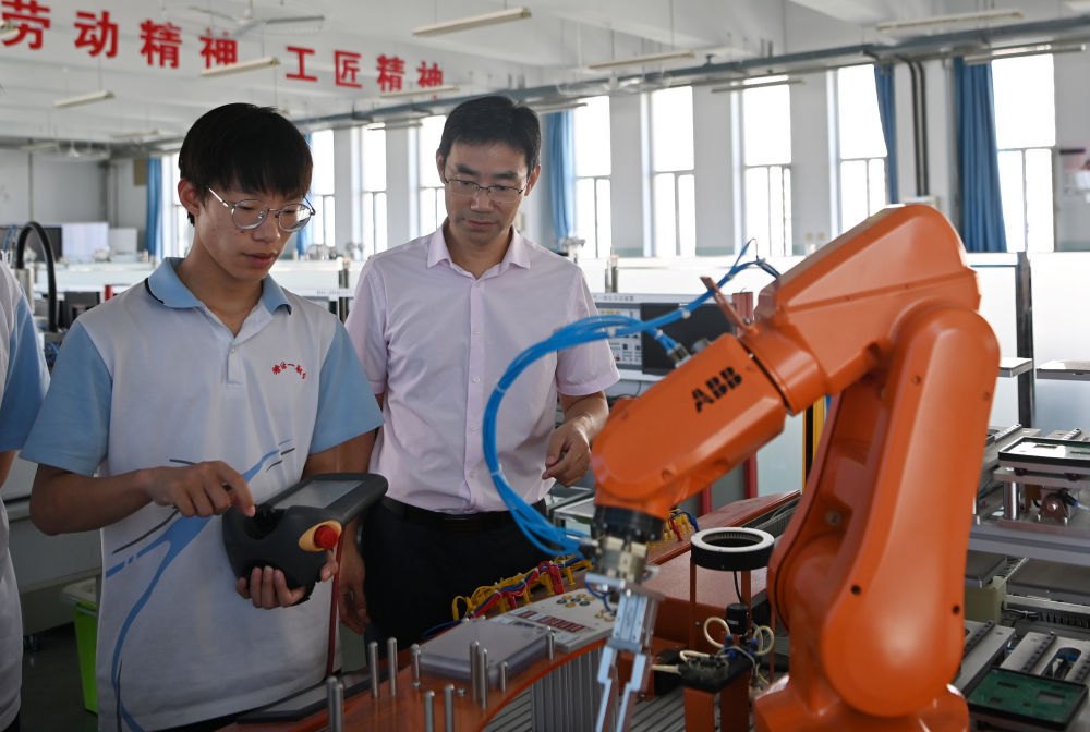 ↑天津市濱海新區(qū)塘沽第一職業(yè)中等專業(yè)學(xué)校教師(右)指導(dǎo)學(xué)生使用機(jī)械設(shè)備