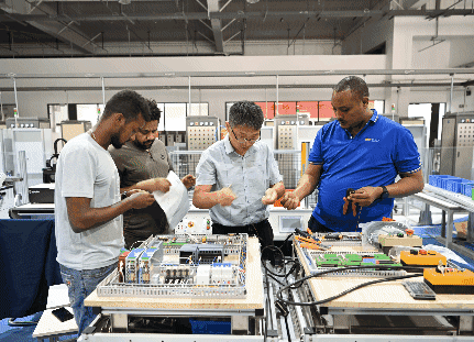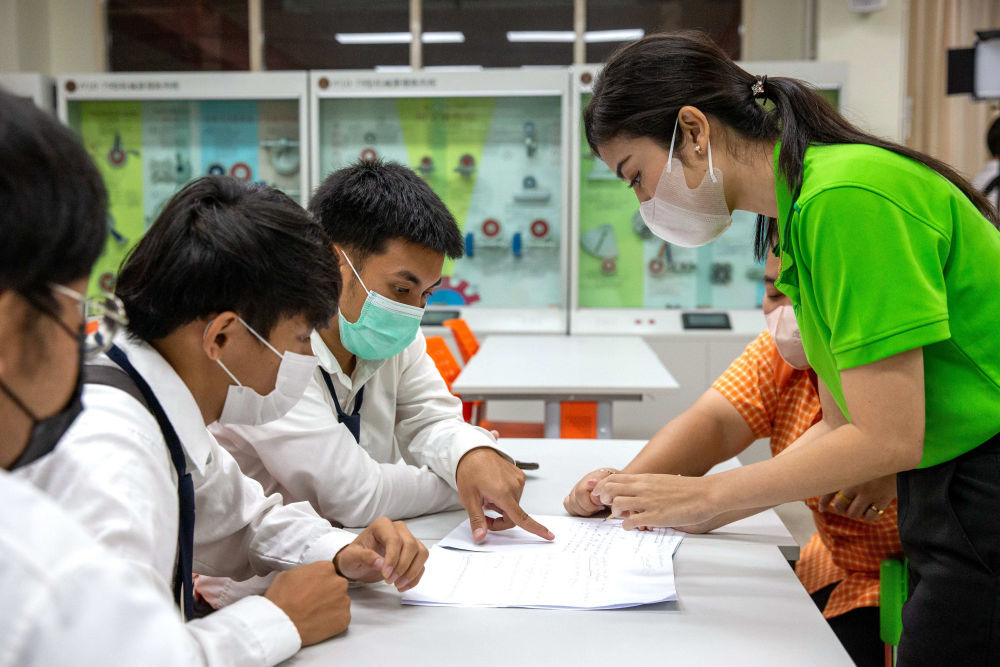 ↑泰國學(xué)生在大城技術(shù)學(xué)院內(nèi)的魯班工坊學(xué)習(xí)交流