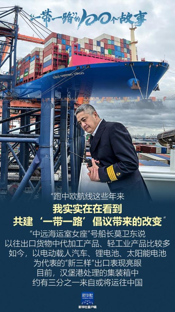 “跑中歐航線這些年來,我實實在在看到共建‘一帶一路’倡議帶來的改變?!薄爸羞h(yuǎn)海運室女座”號船長莫衛(wèi)東說,以往出口貨物中代加工產(chǎn)品、輕工業(yè)產(chǎn)品比較多。如今,以電動載人汽車、鋰電池、太陽能電池為代表的“新三樣”出口表現(xiàn)亮眼。目前,漢堡港處理的集裝箱中,約有三分之一來自或?qū)⑦\往中國。(記者:魏一駿、曹佩弦、檀易曉)