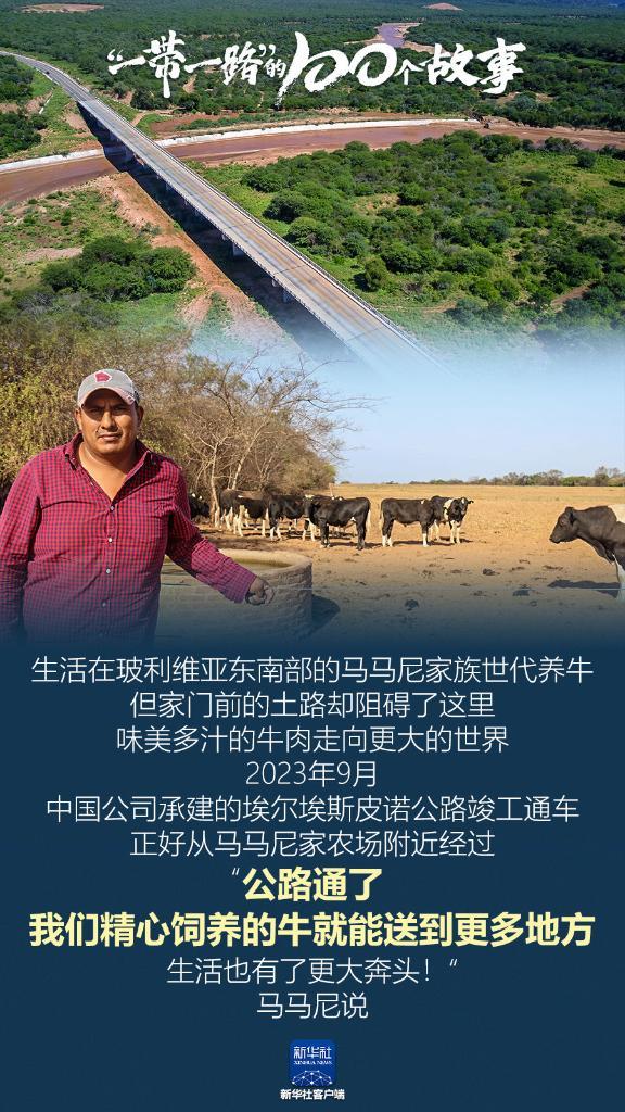 生活在玻利維亞東南部的馬馬尼家族世代養(yǎng)牛,但家門前的土路卻阻礙了這里味美多汁的牛肉走向更大的世界。2023年9月,中國公司承建的埃爾埃斯皮諾公路竣工通車,正好從馬馬尼家農(nóng)場附近經(jīng)過?!肮吠耍覀兙娘曫B(yǎng)的牛就能送到更多地方,生活也有了更大奔頭!”馬馬尼說。(記者:郝云甫、吳昊)