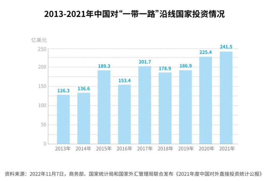 截至2021年底,中國在“一帶一路”沿線國家設(shè)立企業(yè)超過1.1萬家,約占中國境外企業(yè)總量的1/4。2021年,對“一帶一路”沿線國家直接投資241.5億美元,創(chuàng)歷史新高,占中國全年對外投資流量總額的13.5%;年末存量2138.4億美元,占存量總額的7.7%。[16]