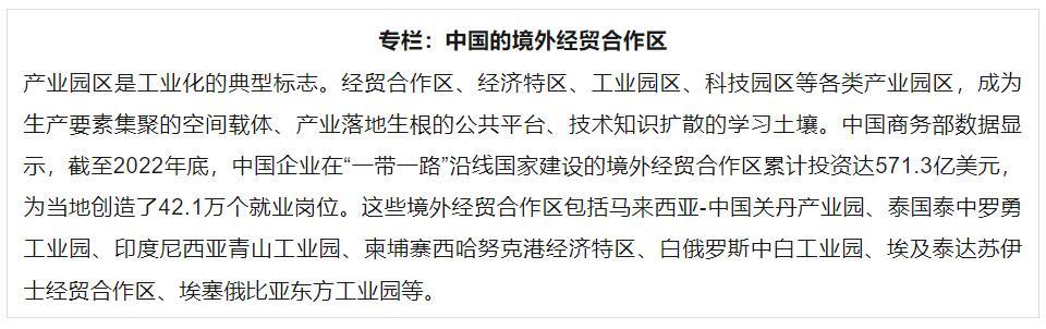 共建“一帶一路”國家的產(chǎn)業(yè)合作,推動并強(qiáng)化了這一趨勢。中泰新絲路塔吉克斯坦農(nóng)業(yè)紡織產(chǎn)業(yè)園,幫助當(dāng)?shù)貜拿藁ǚN植向棉紡織全產(chǎn)業(yè)鏈跨越。印度尼西亞摩洛哇麗縣的青山工業(yè)園區(qū),將曾經(jīng)偏僻的小漁村變成了全球重要的鎳礦開采冶煉和不銹鋼產(chǎn)業(yè)基地,助力印尼“從賣30美元/噸鎳原礦到賣2300美元/噸不銹鋼”。在埃及泰達(dá)蘇伊士經(jīng)貿(mào)合作區(qū),巨石玻璃纖維公司建成年產(chǎn)20萬噸玻璃纖維生產(chǎn)線,令埃及成為全球第四大玻纖生產(chǎn)和貿(mào)易國,吸引大量上下游企業(yè)赴埃投資。