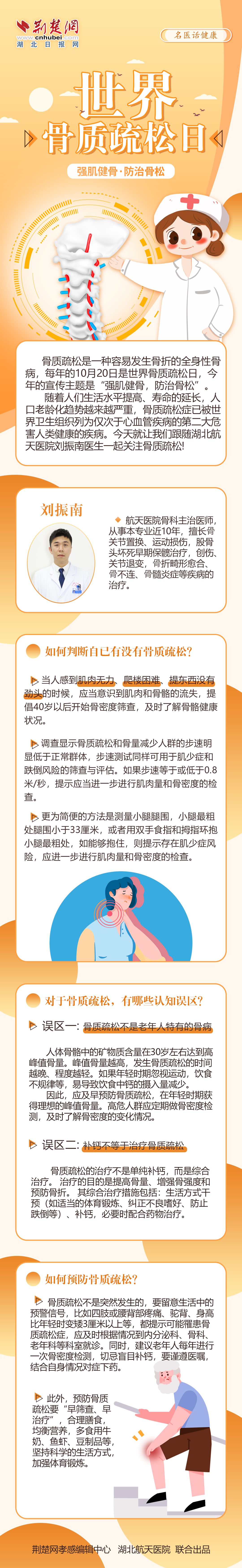 隨著人們生活水平提高、壽命的延長,人口老齡化趨勢越來越嚴(yán)重,骨質(zhì)疏松癥已被世界衛(wèi)生組織列為僅次于心血管疾病的第二大危害人類健康的疾病。今天就讓我們跟隨湖北航天醫(yī)院劉振南醫(yī)生一起關(guān)注骨質(zhì)疏松!
