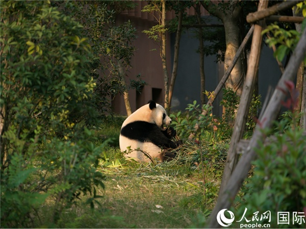 大熊貓?jiān)谶M(jìn)食。人民網(wǎng)記者 楊爍壁攝